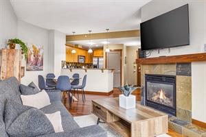Now lets talk about the inside of this GEM! When you walk in you will be wowed by the gorgeous floors and high end finishings. The fully stocked kitchen with stainless steel appliances with everything you may need to stay in and make a delicious meal. This condo is a spacious 970 square feet and has a king size master bedroom with walk in closet and ensuite bathroom. There's also a second bedroom with a brand new queen size bed. The living room has ample space with new and comfortable furnishings, a gas fireplace, and a new smart TV. Then, walk out onto your large balcony and enjoy the stunning view of the 3 Sisters mountain peaks! There's also a gas bbq for you to enjoy during your stay.
