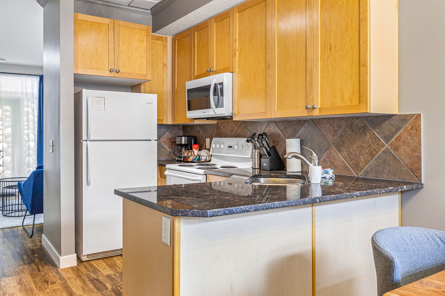 * Kitchen includes dishes, pots, pans, knives, casserole dishes, blender, dishwasher, microwave, fridge/freezer, drip coffee maker, kettle