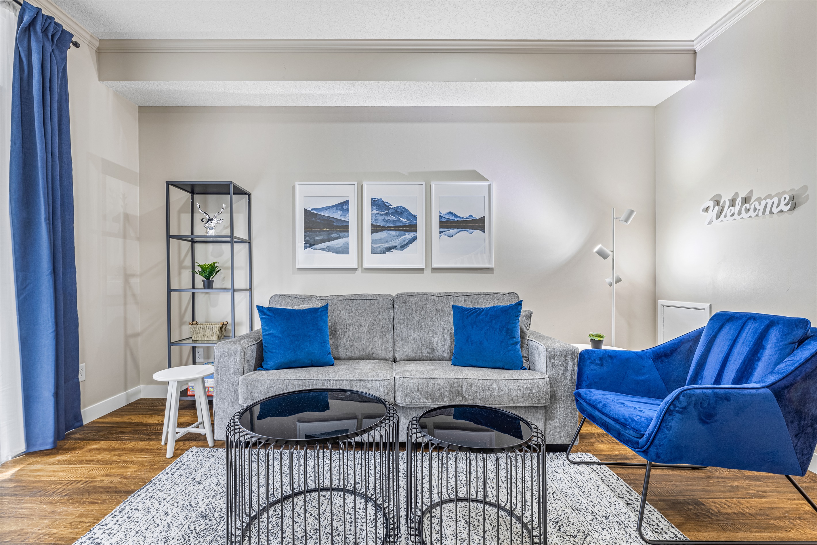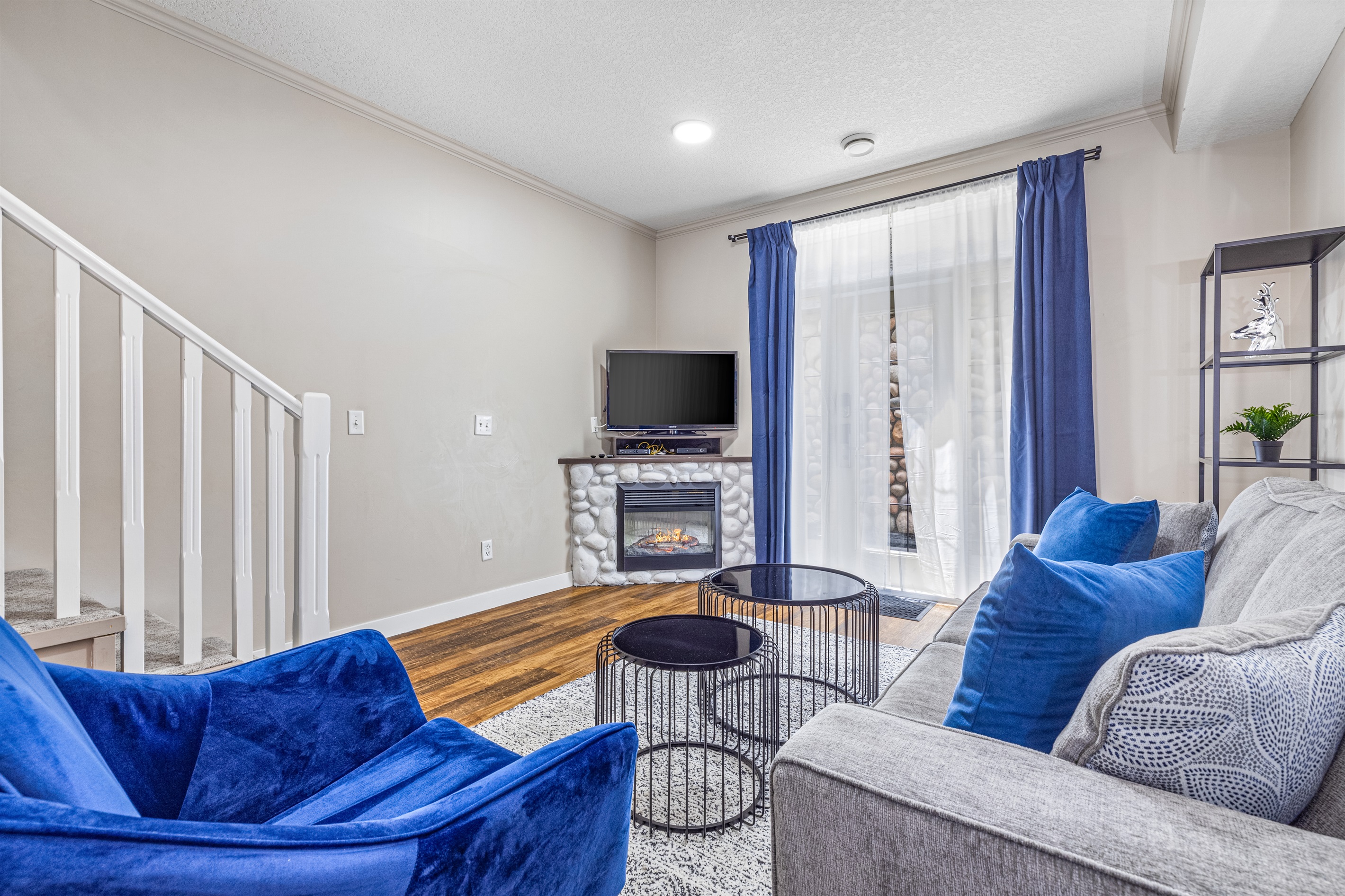 * Living room sofa bed and seating area with electric fireplace and blackout curtains
